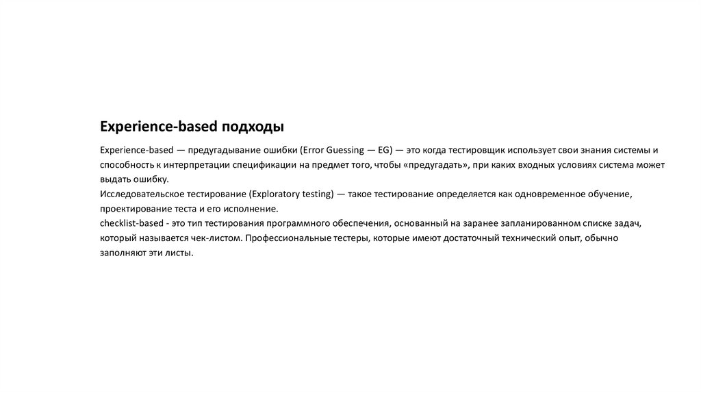 Experience-based подходыExperience-based — предугадывание ошибки (Error Guessing — EG) — это когда тестировщик использует свои знания системы и