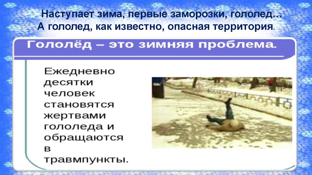 Наступает зима, первые заморозки, гололед…А гололед, как известно, опасная территория.