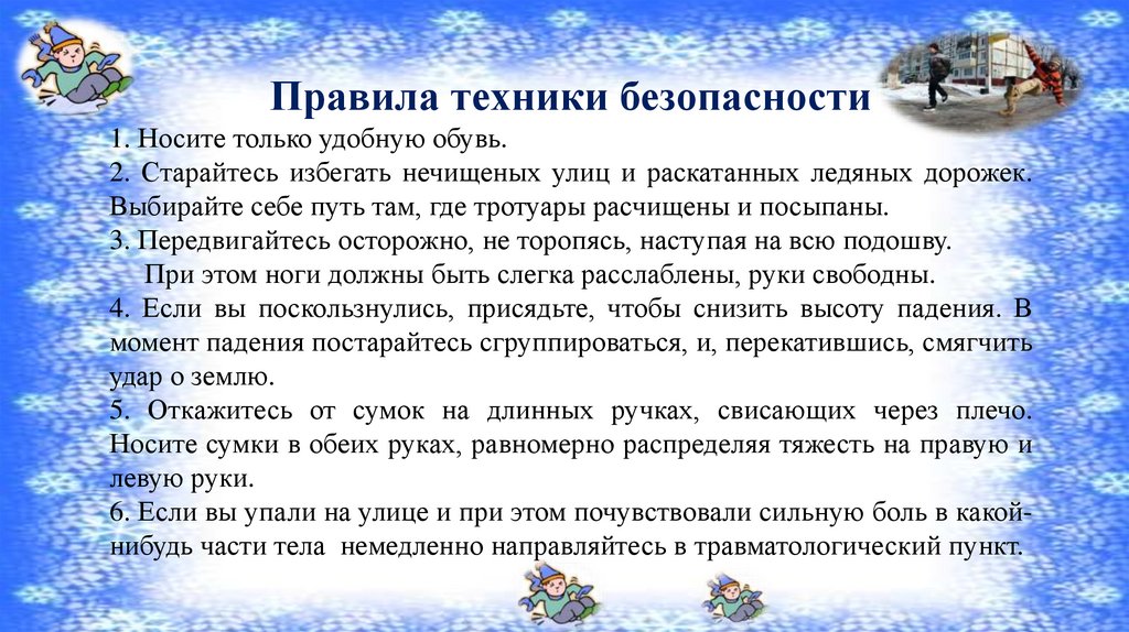 6. Если вы упали на улице и при этом почувствовали сильную боль в какойнибудь части тела немедленно направляйтесь в травматологический пункт.