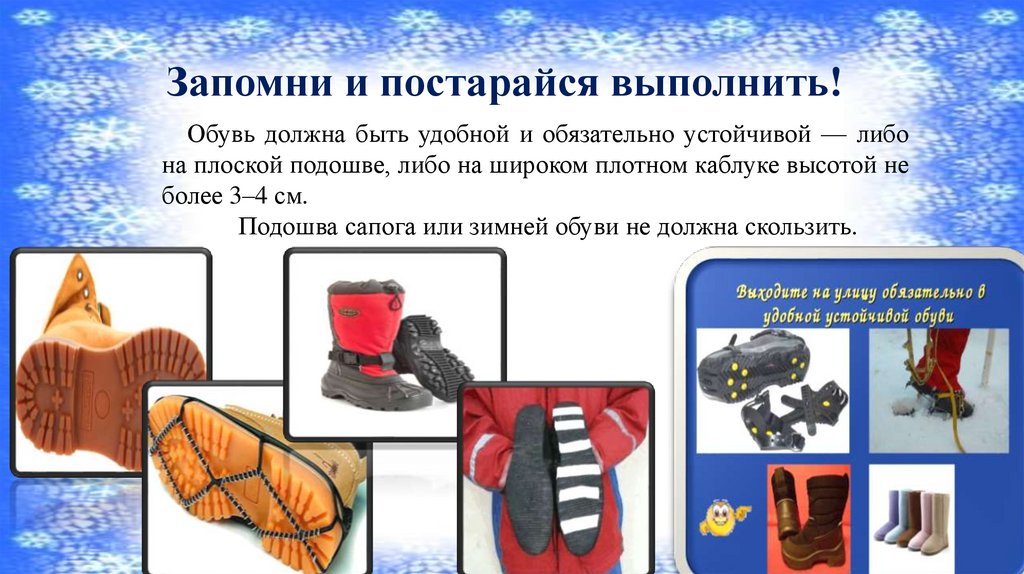 Запомни и постарайся выполнить!Обувь должна быть удобной и обязательно устойчивой — либо