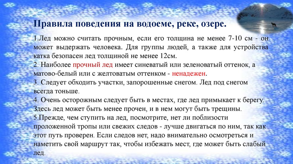 Правила поведения на водоеме, реке, озере.1.Лед можно считать прочным, если его толщина не менее 7-10 см - он