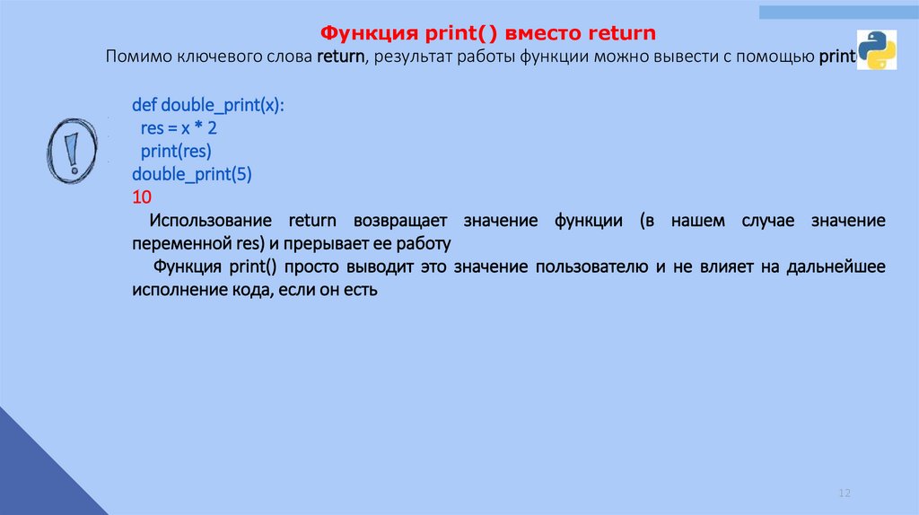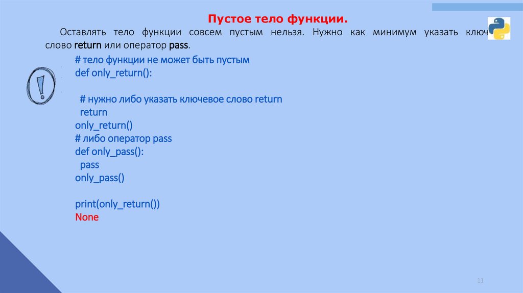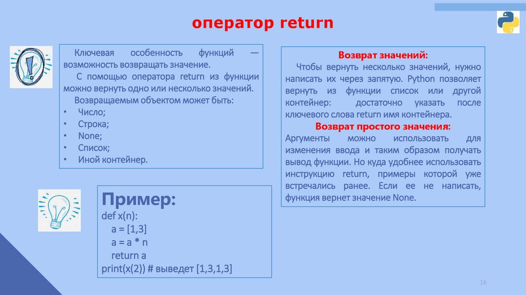 Чтобы выйти из функции в Python, используют оператор return [значение]. Если оператор