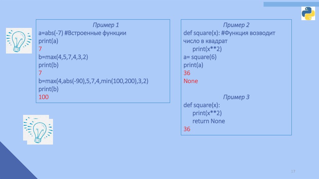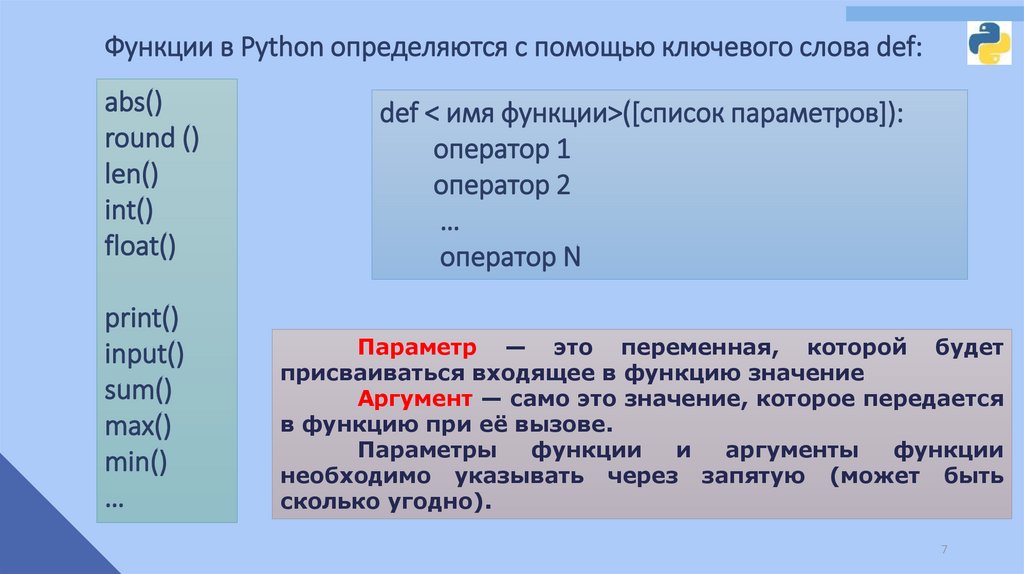 Функции в Python определяются с помощью ключевого слова def:abs()