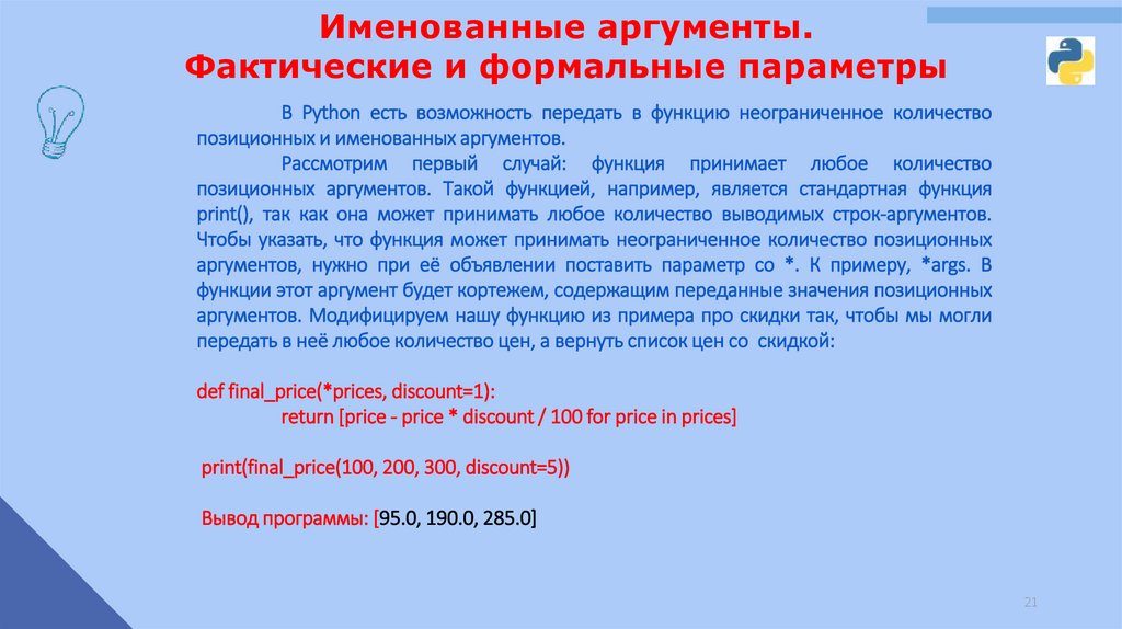 аргументов. Модифицируем нашу функцию из примера про скидки так, чтобы мы могли