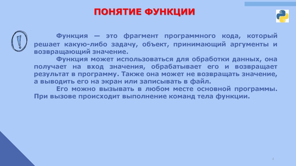 ПОНЯТИЕ ФУНКЦИИФункция — это фрагмент программного кода, который