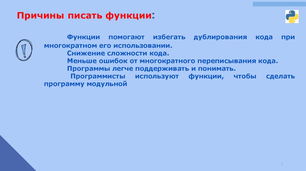 Причины писать функции:Функции помогают избегать дублирования кода при