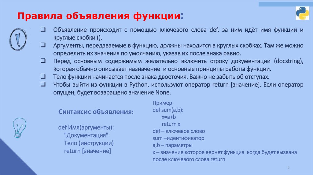 Правила объявления функции:Объявление происходит с помощью ключевого слова def, за ним идёт имя функции и