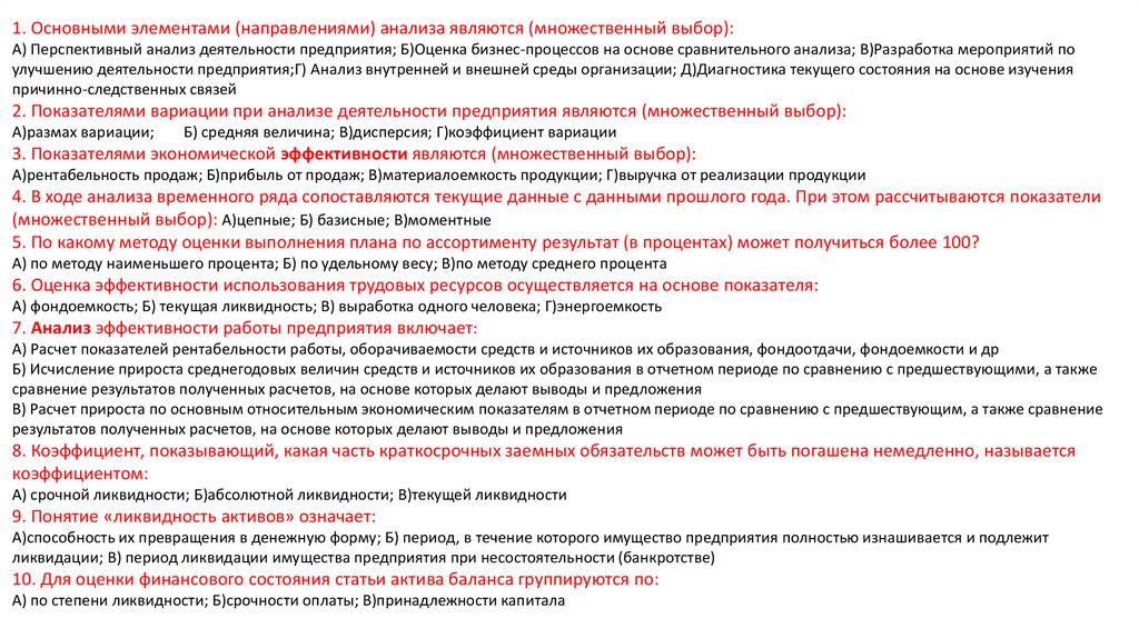 1. Основными элементами (направлениями) анализа являются (множественный выбор):А) Перспективный анализ деятельности предприятия; Б)Оценка бизнес-процессов на основе сравнительного анализа; В)Разработка мероприятий по