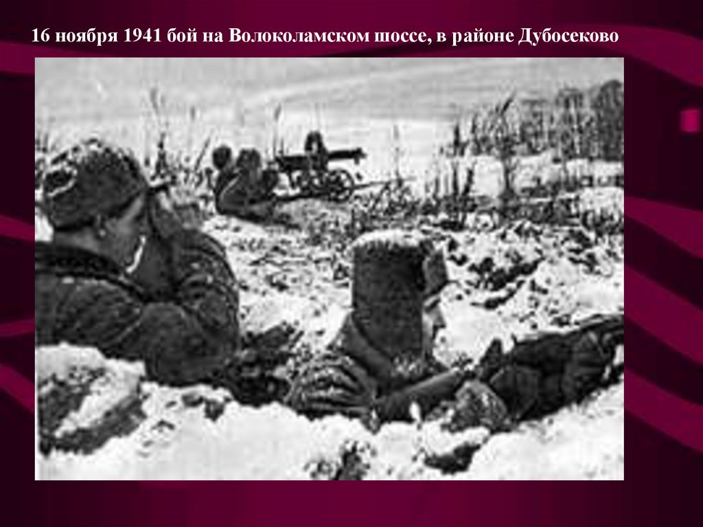 16 ноября 1941 бой на Волоколамском шоссе, в районе Дубосеково9.
