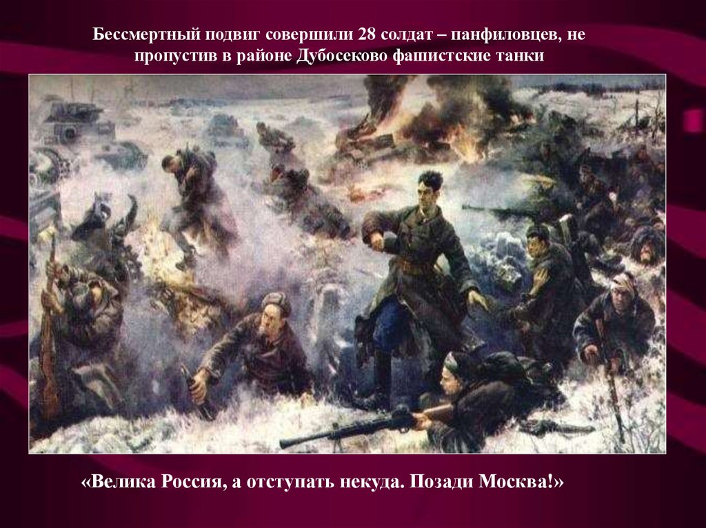 Бессмертный подвиг совершили 28 солдат – панфиловцев, непропустив в районе Дубосеково фашистские танки
