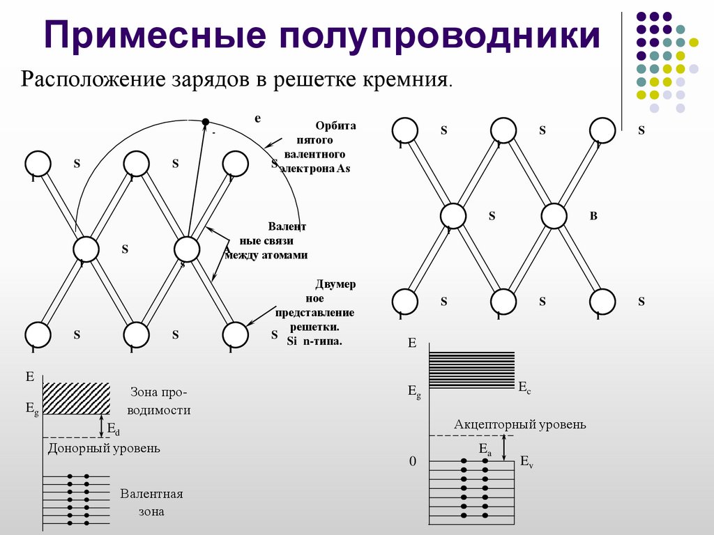 Примесные полупроводникиРасположение зарядов в решетке кремния.