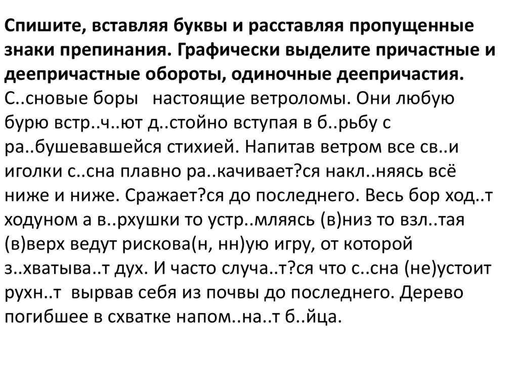 Спишите, вставляя буквы и расставляя пропущенныезнаки препинания. Графически выделите причастные и
