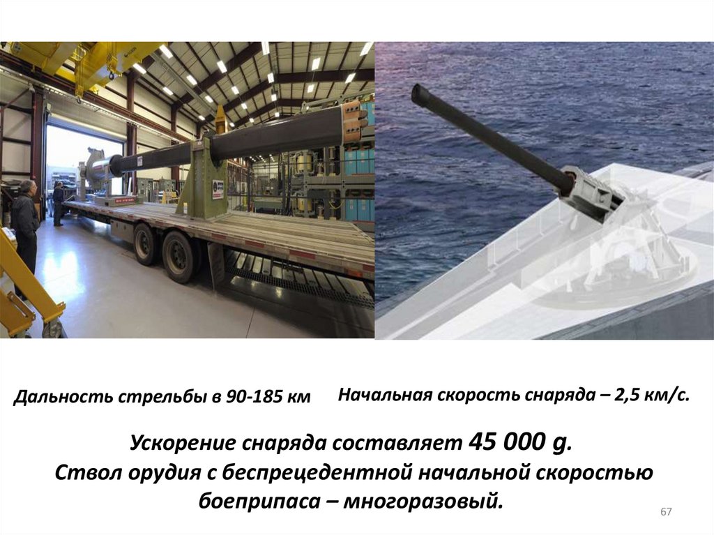 Дальность стрельбы в 90-185 кмНачальная скорость снаряда – 2,5 км/с.