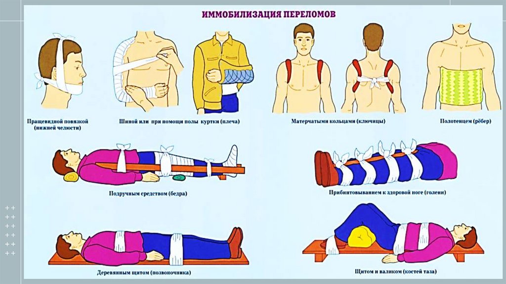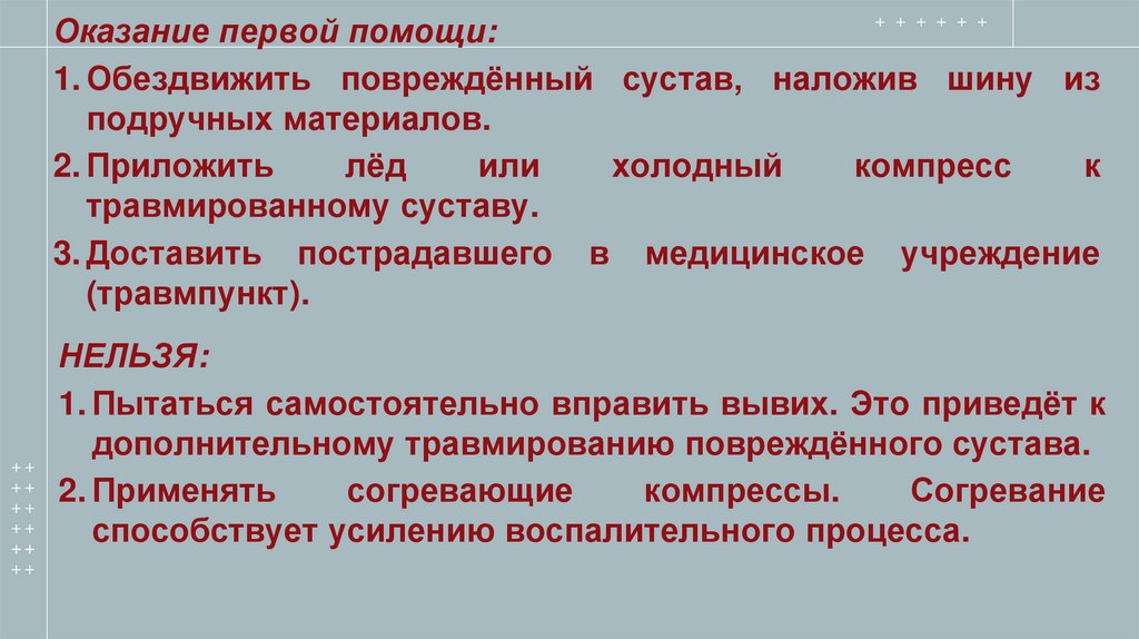 Оказание первой помощи:1. Обездвижить повреждённый сустав, наложив шину из