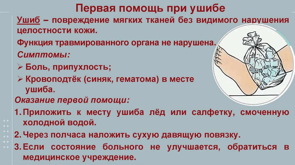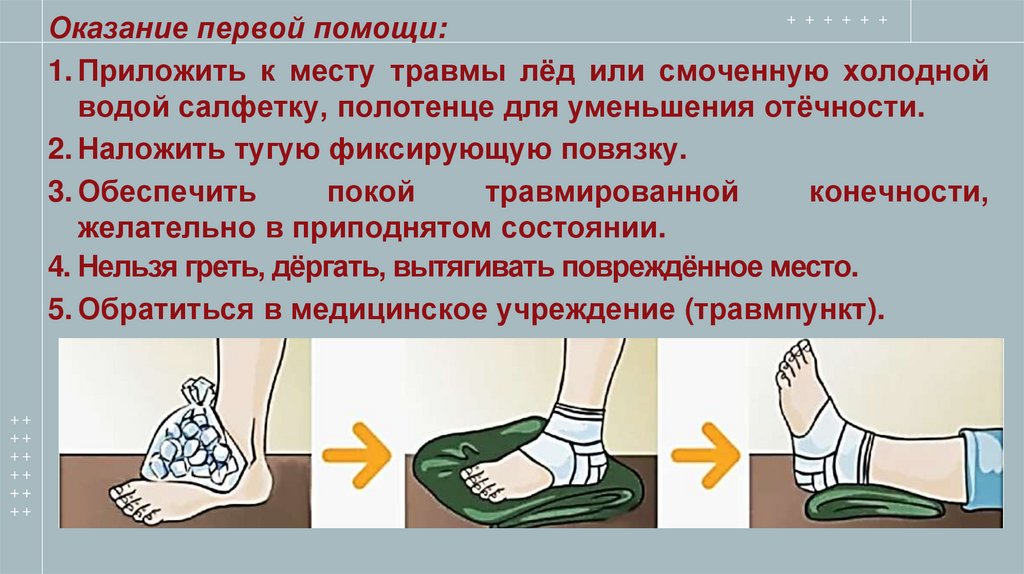 Оказание первой помощи:1. Приложить к месту травмы лёд или смоченную холодной