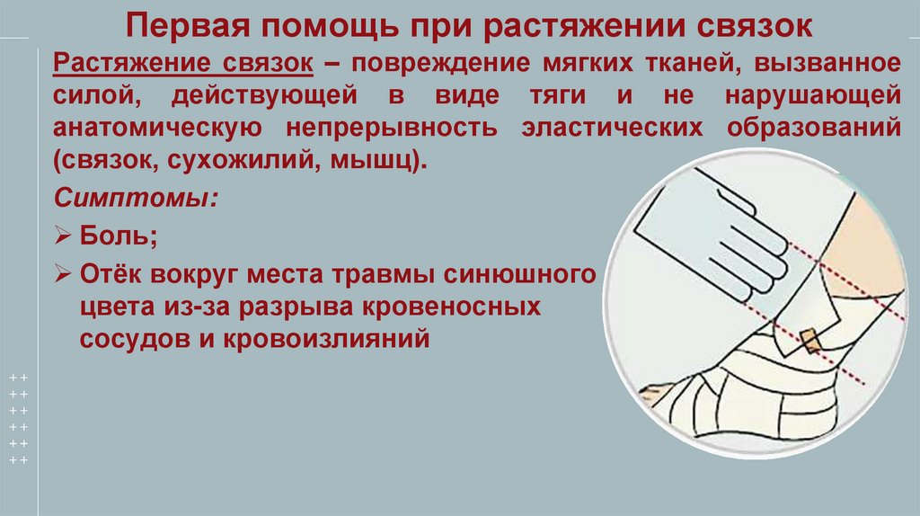 Первая помощь при растяжении связокРастяжение связок – повреждение мягких тканей, вызванное