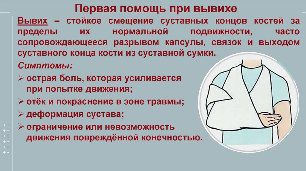 Первая помощь при вывихеВывих – стойкое смещение суставных концов костей за