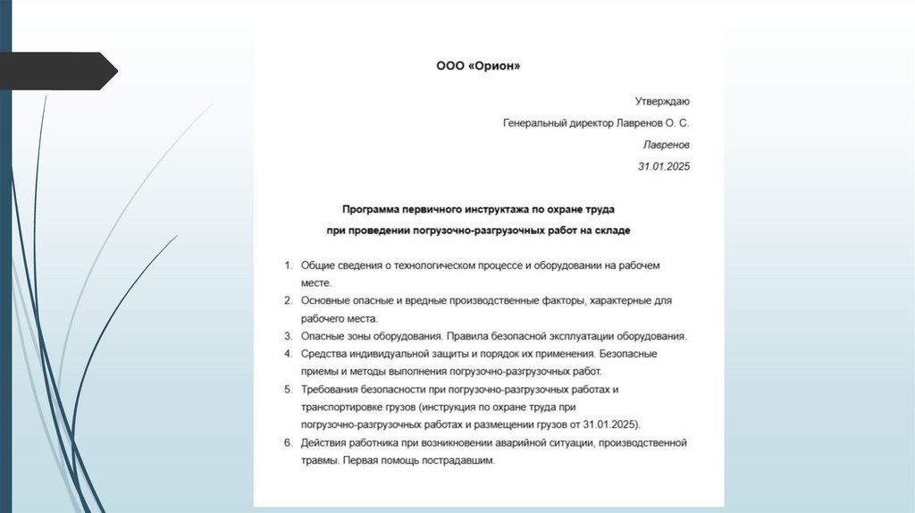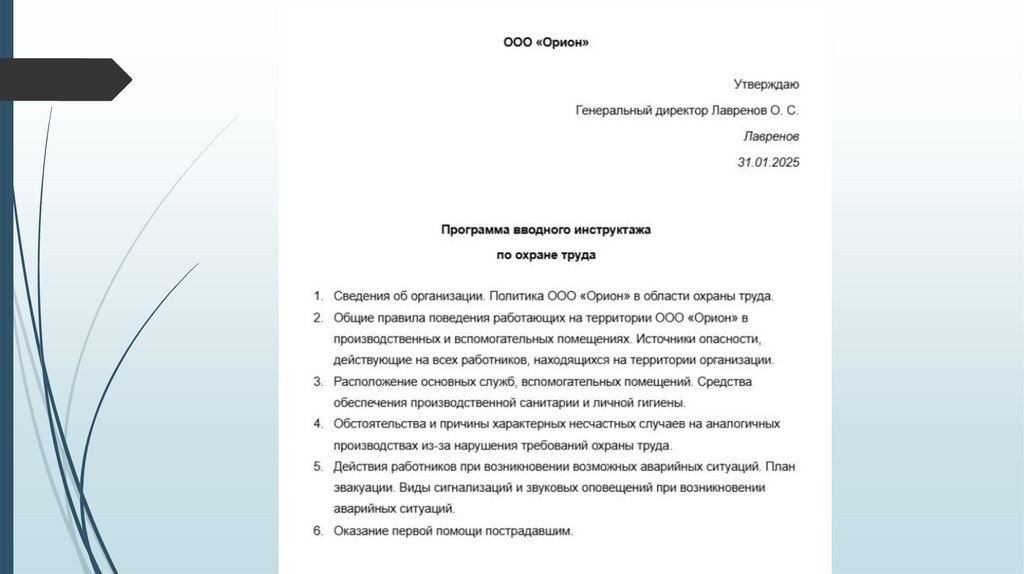 Проводят до того, как работник приступит к своим обязанностям.Программу разрабатывают на основании перечня тем,