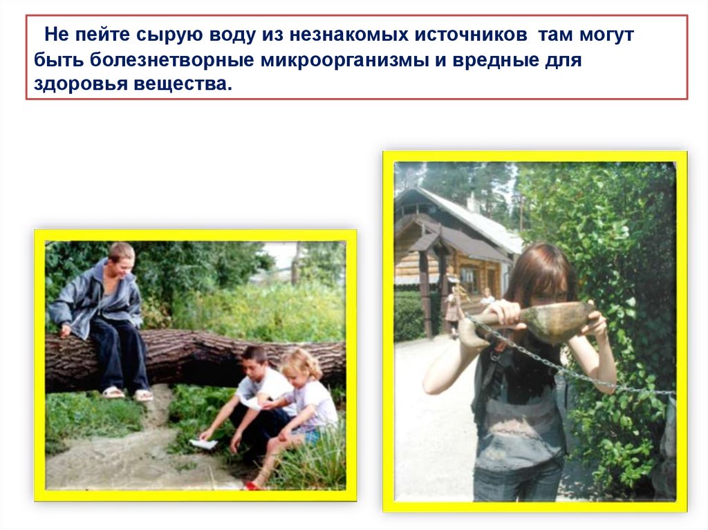 Не пейте сырую воду из незнакомых источников там могутбыть болезнетворные микроорганизмы и вредные для
