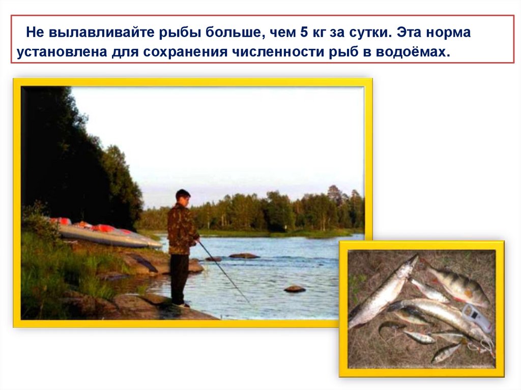 Не вылавливайте рыбы больше, чем 5 кг за сутки. Эта нормаустановлена для сохранения численности рыб в водоёмах.