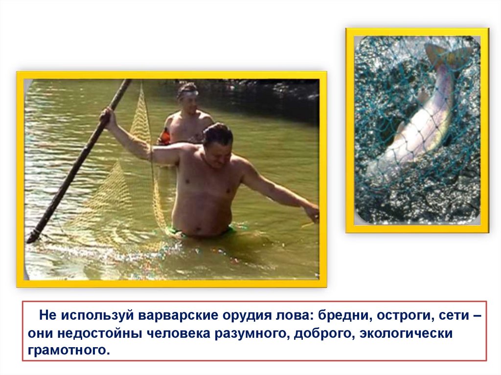Не используй варварские орудия лова: бредни, остроги, сети –они недостойны человека разумного, доброго, экологически