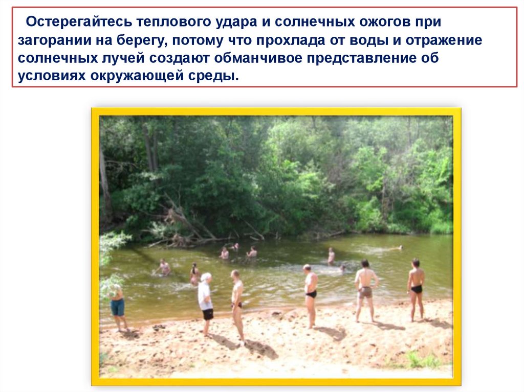 Остерегайтесь теплового удара и солнечных ожогов призагорании на берегу, потому что прохлада от воды и отражение