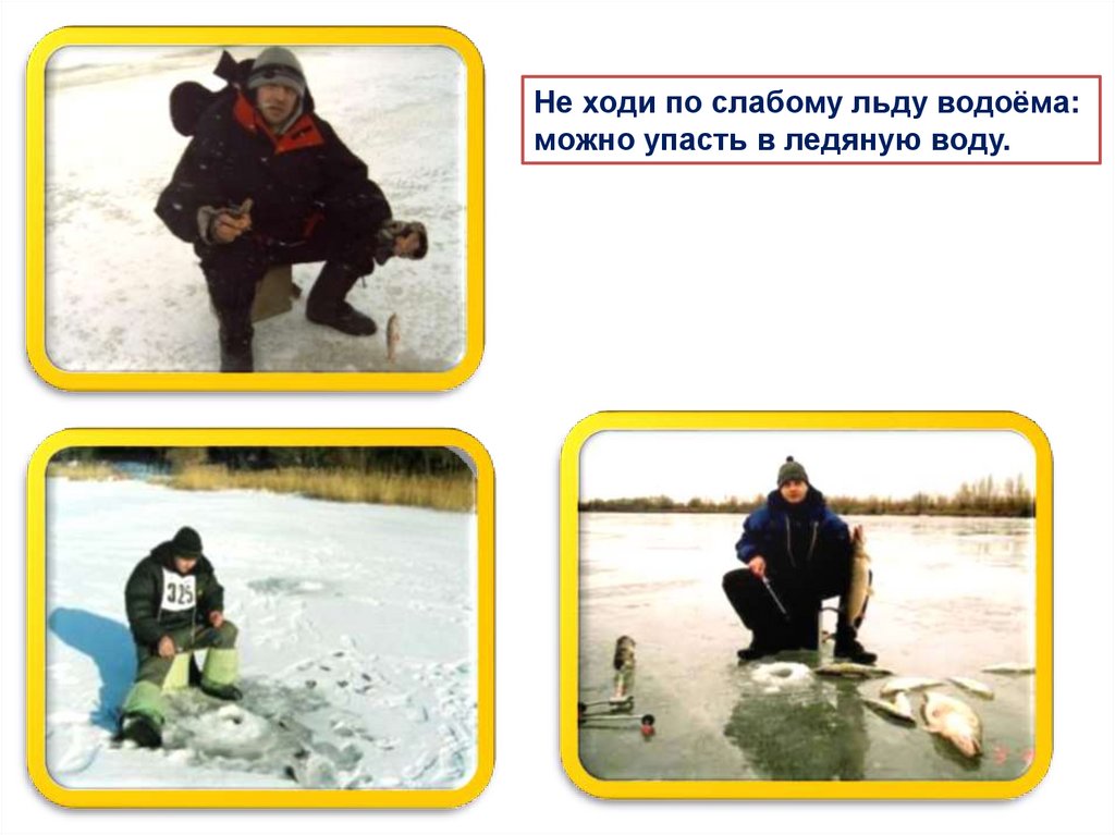 Не ходи по слабому льду водоёма:можно упасть в ледяную воду.