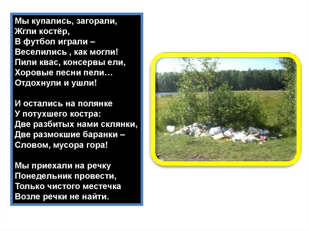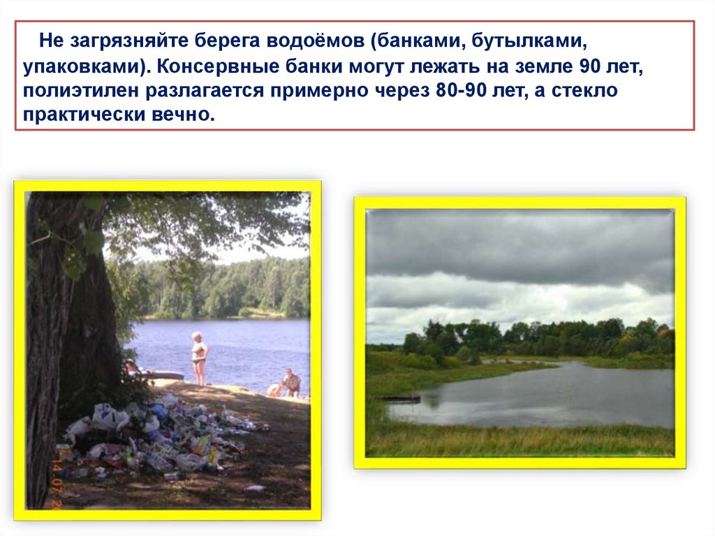 Не загрязняйте берега водоёмов (банками, бутылками,упаковками). Консервные банки могут лежать на земле 90 лет,