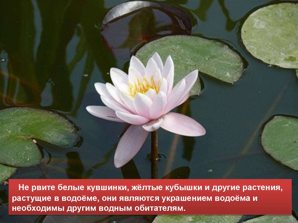 Не рвите белые кувшинки, жёлтые кубышки и другие растения,растущие в водоёме, они являются украшением водоёма и