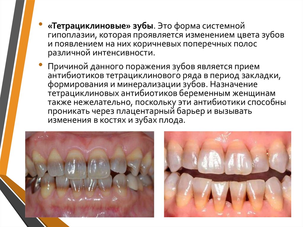 • «Тетрациклиновые» зубы. Это форма системнойгипоплазии, которая проявляется изменением цвета зубов