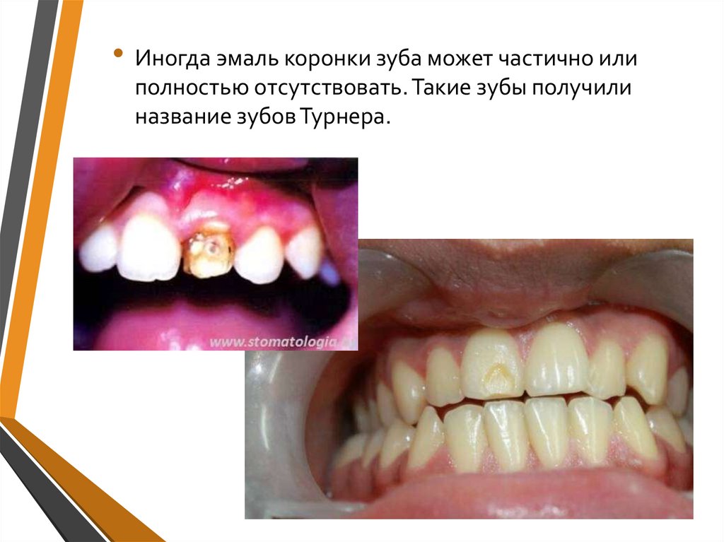 • Иногда эмаль коронки зуба может частично илиполностью отсутствовать. Такие зубы получили
