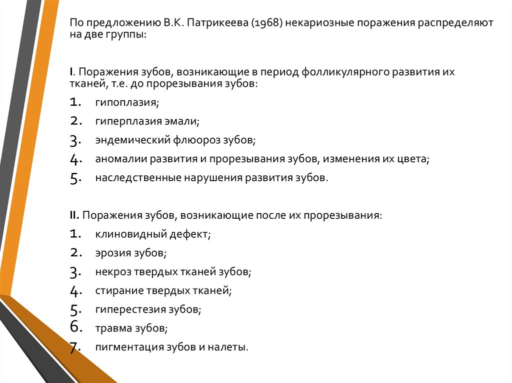 По предложению В.К. Патрикеева (1968) некариозные поражения распределяютна две группы: