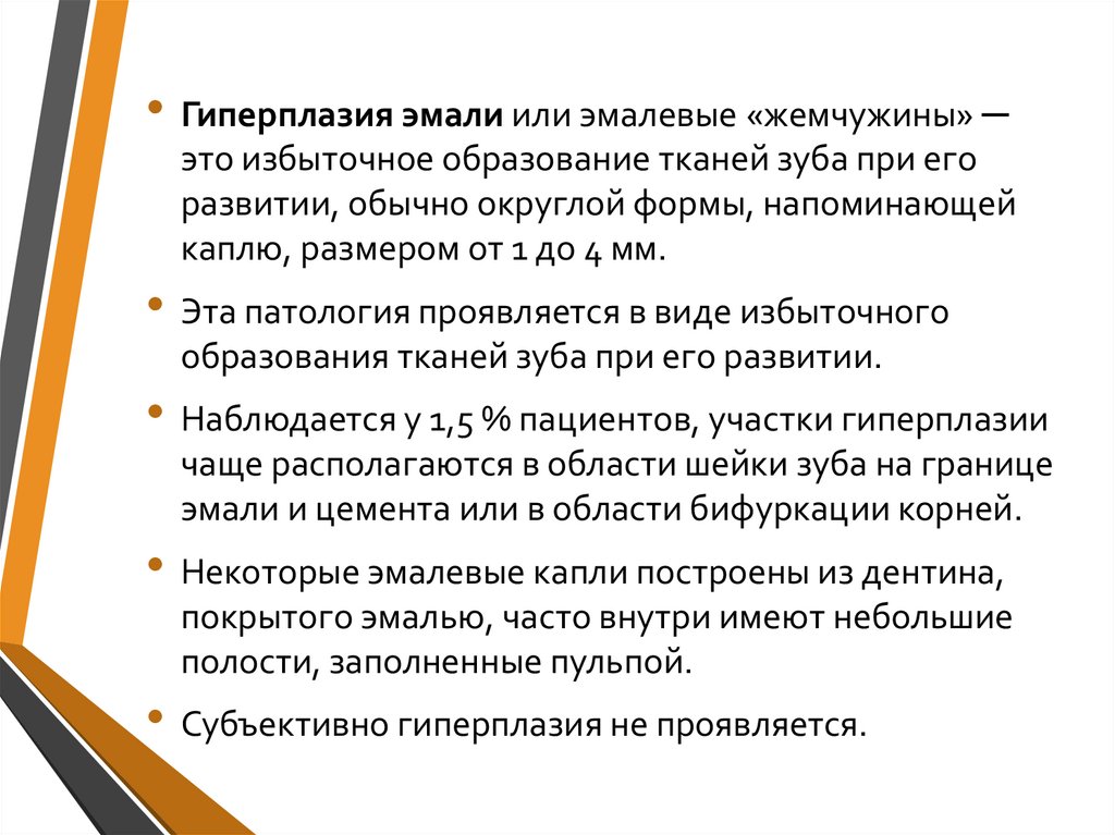 • Гиперплазия эмали или эмалевые «жемчужины» ─это избыточное образование тканей зуба при его