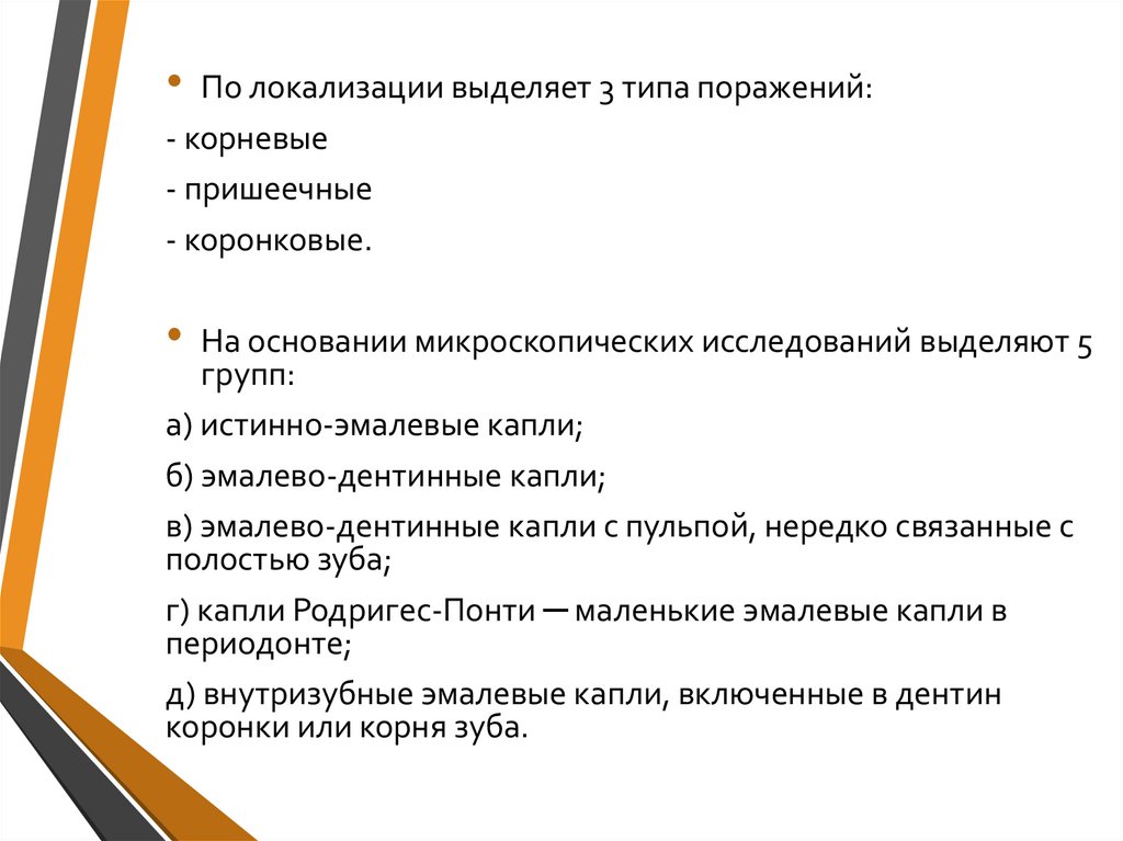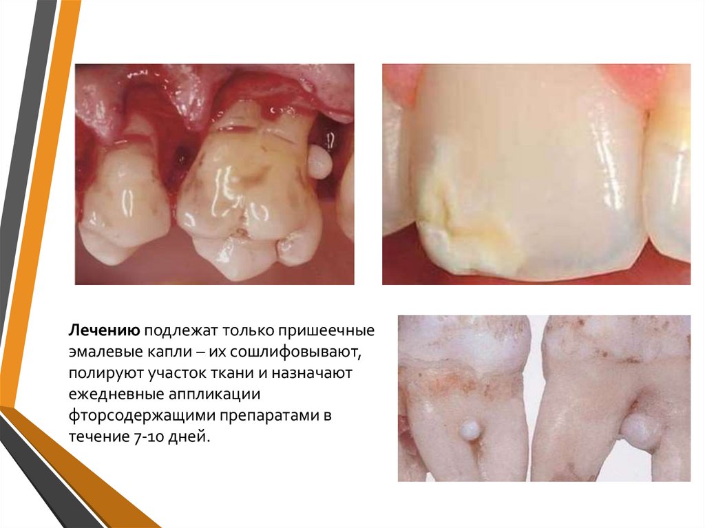 Лечению подлежат только пришеечныеэмалевые капли – их сошлифовывают,