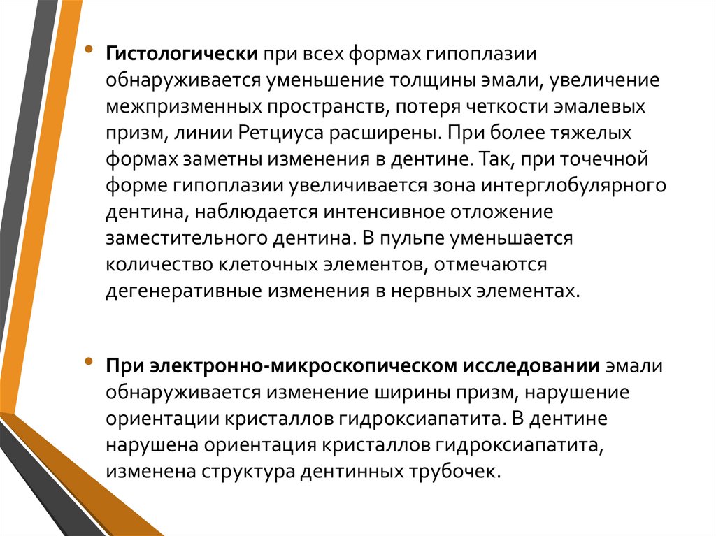 • Гистологически при всех формах гипоплазииобнаруживается уменьшение толщины эмали, увеличение