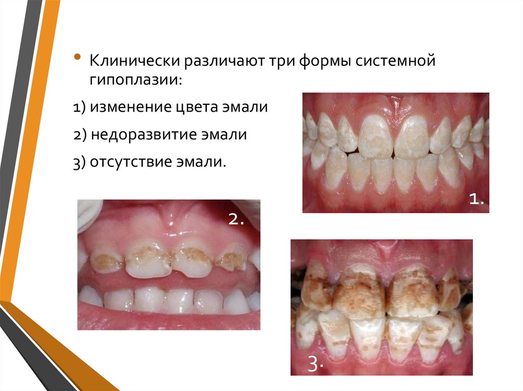• Системная гипоплазия эмали встречается как во временныхзубах, так и в постоянных зубах.