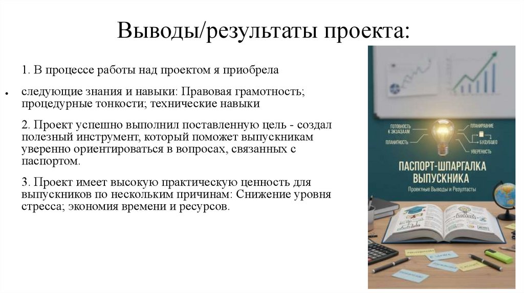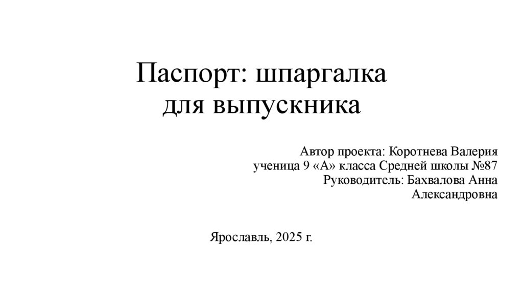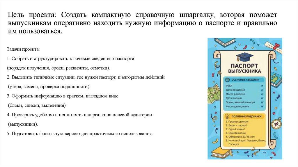 Цель проекта: Создать компактную справочную шпаргалку, которая поможетвыпускникам оперативно находить нужную информацию о паспорте и правильно