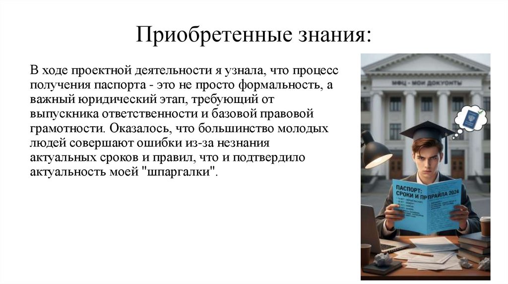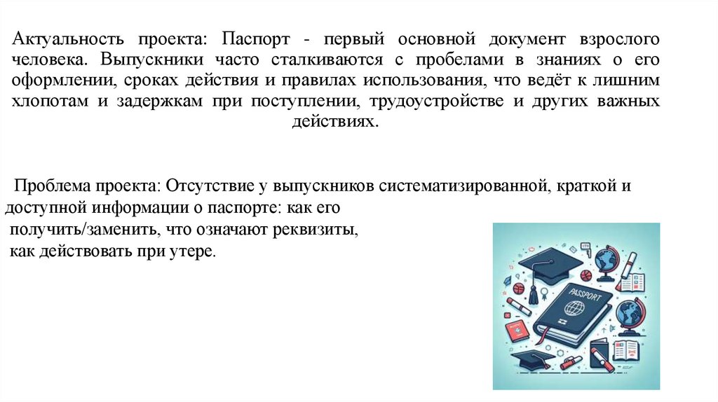 Актуальность проекта: Паспорт - первый основной документ взрослогочеловека. Выпускники часто сталкиваются с пробелами в знаниях о его