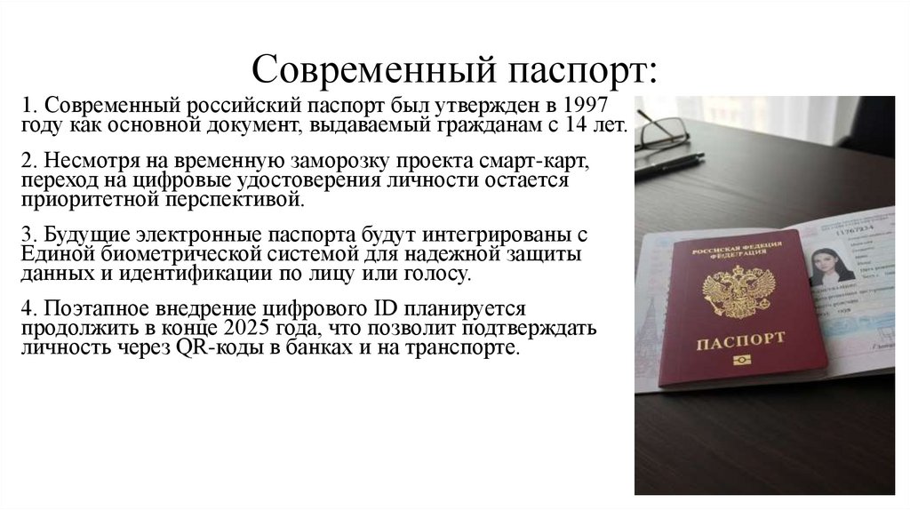Современный паспорт:1. Современный российский паспорт был утвержден в 1997