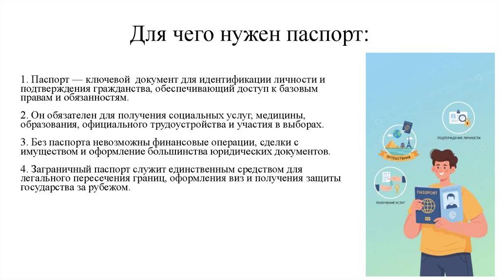 Для чего нужен паспорт:1. Паспорт — ключевой документ для идентификации личности и