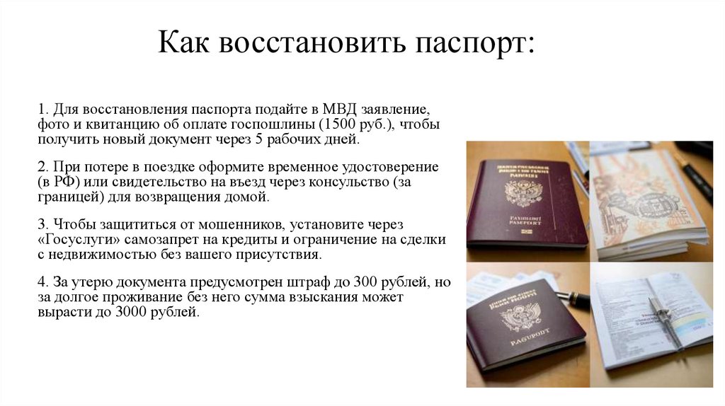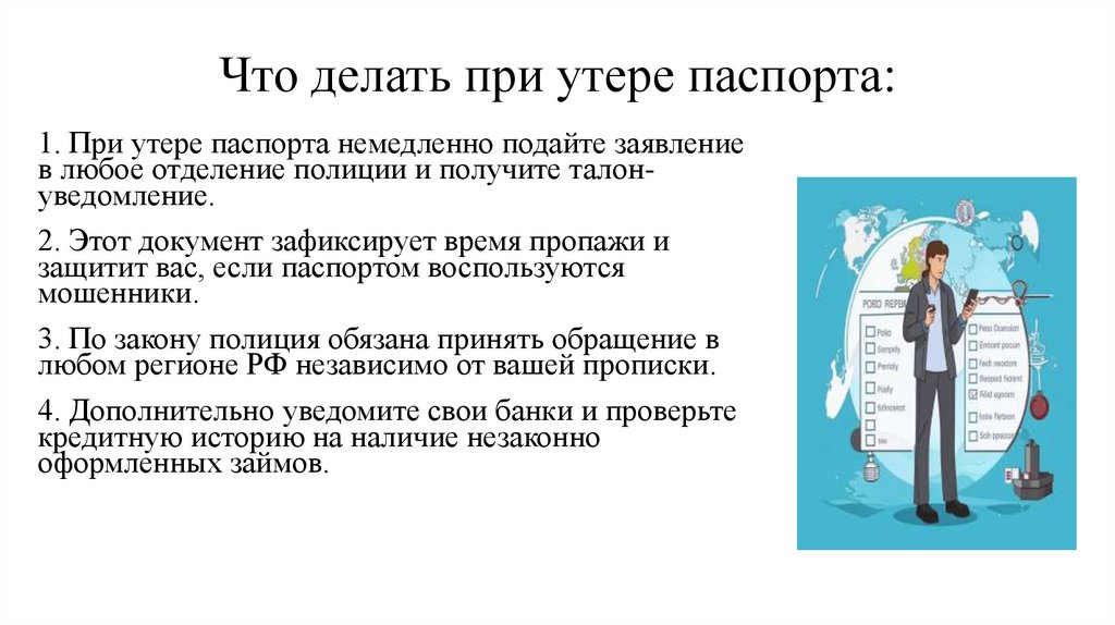 Что делать при утере паспорта:1. При утере паспорта немедленно подайте заявление