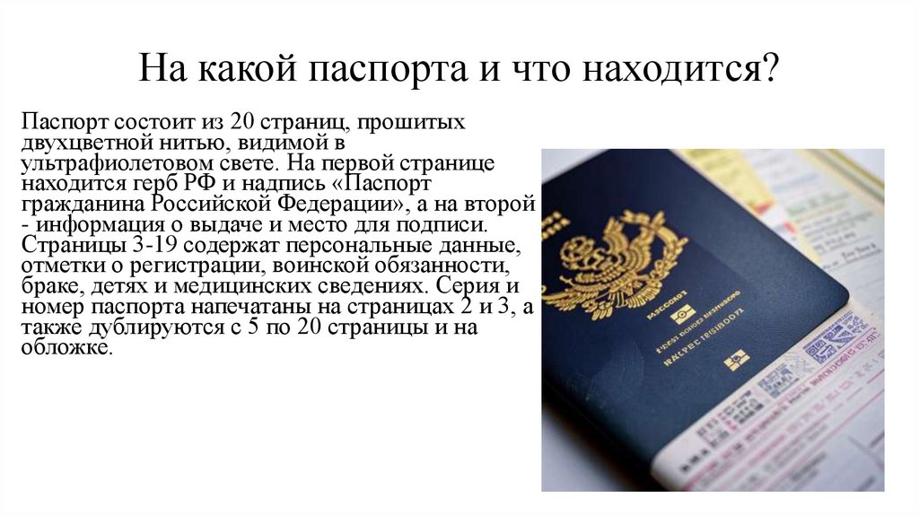 На какой паспорта и что находится?Паспорт состоит из 20 страниц, прошитых