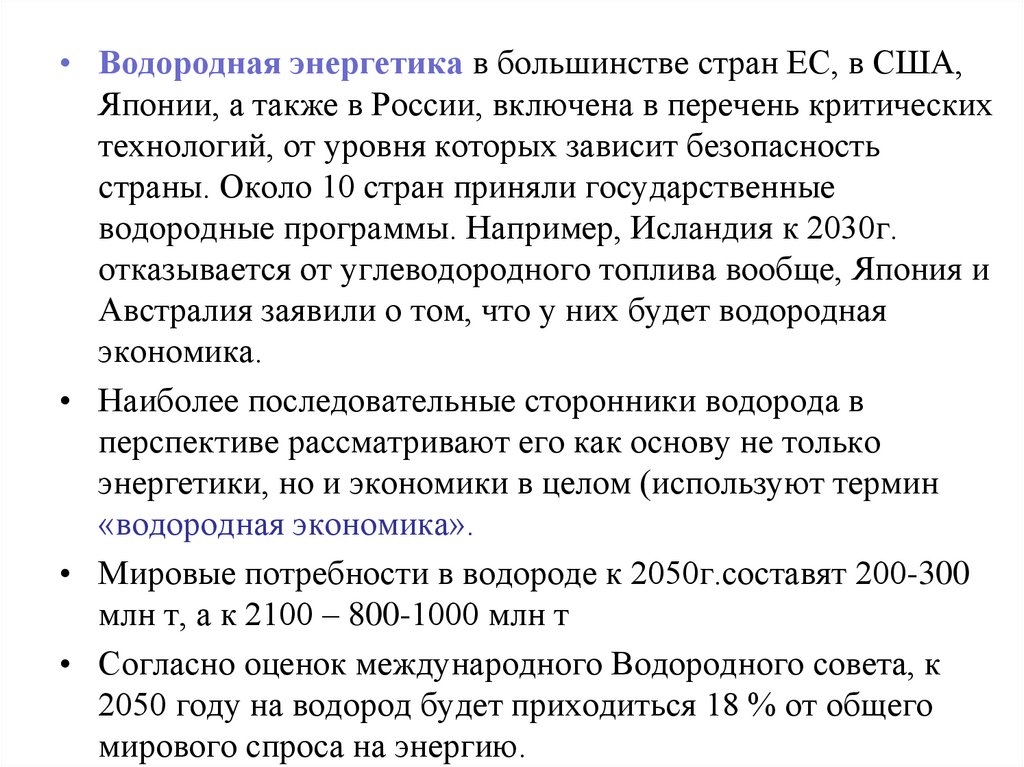 • Водородная энергетика в большинстве стран ЕС, в США,Японии, а также в России, включена в перечень критических