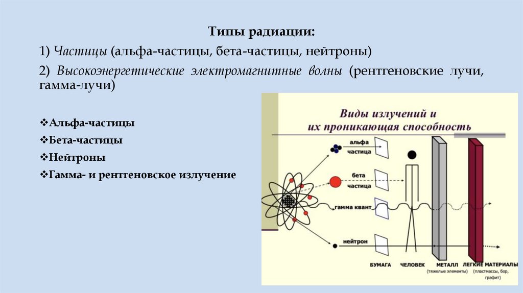 Типы радиации:1) Частицы (альфа-частицы, бета-частицы, нейтроны)