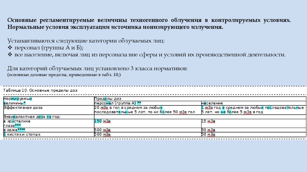 Основные регламентируемые величины техногенного облучения в контролируемых условиях.Нормальные условия эксплуатации источника ионизирующего излучения.