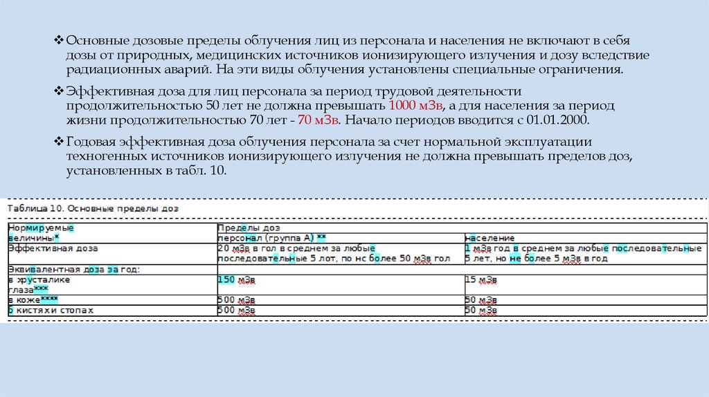Основные дозовые пределы облучения лиц из персонала и населения не включают в себядозы от природных, медицинских источников ионизирующего излучения и дозу вследствие