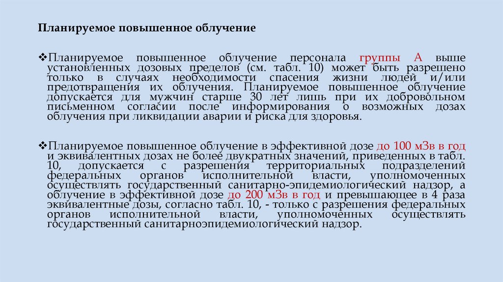 Планируемое повышенное облучение в эффективной дозе до 100 мЗв в год