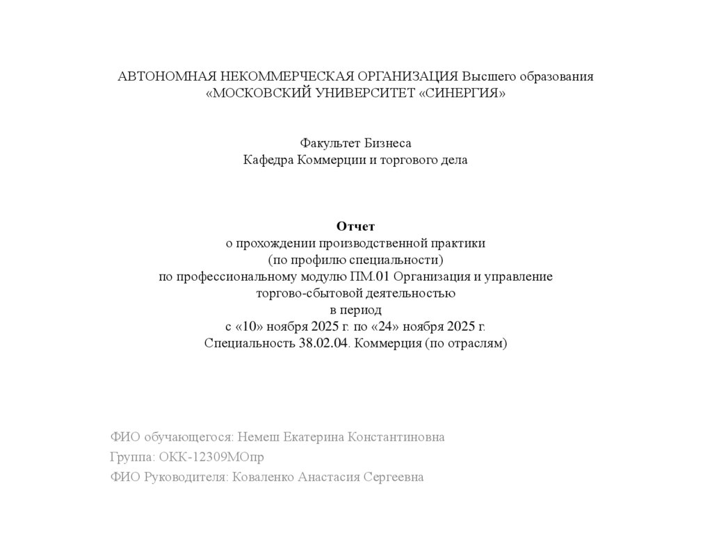 опыта работы по специальности в рамках освоения видадеятельности ВД 1. Организация и управление торгово-сбытовой деятельностью