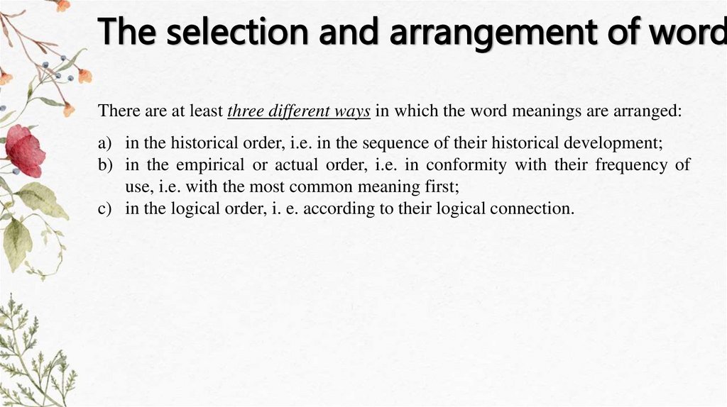The selection and arrangement of wordThere are at least three different ways in which the word meanings are arranged: