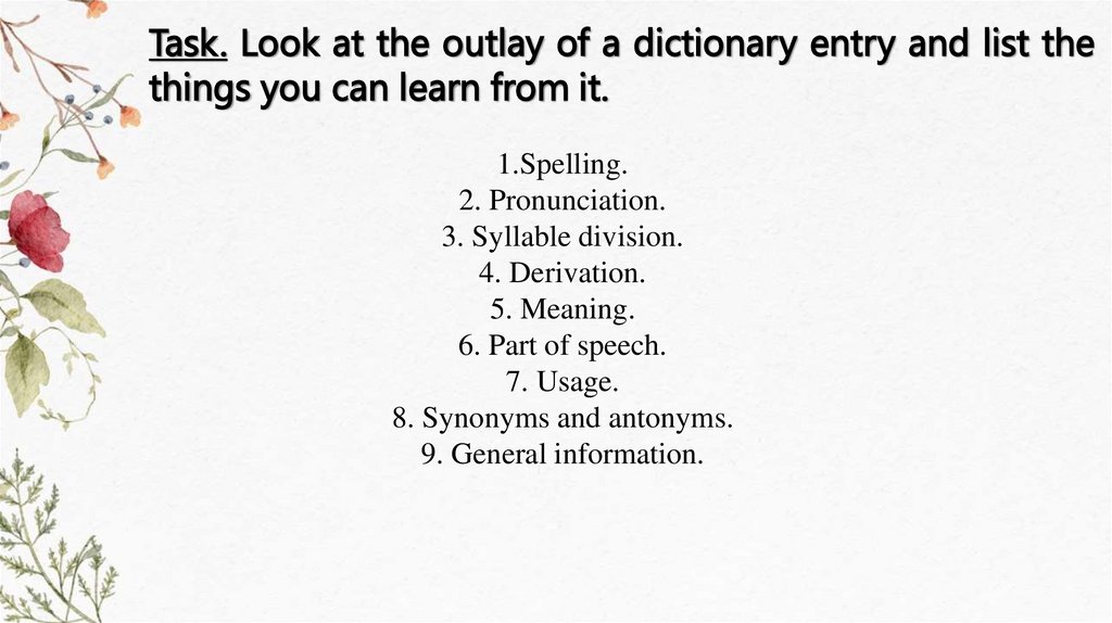 Task. Look at the outlay of a dictionary entry and list thethings you can learn from it.